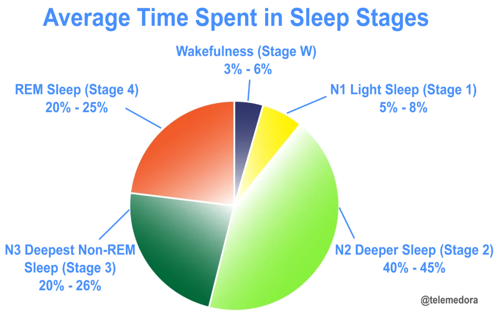 The sleep stages are broadly divided into two main types: Non-Rapid Eye Movement (NREM) sleep and REM (Rapid Eye Movement). NREM sleep usually accounts for about 70-75% of total sleep time while REM sleep accounts for the rest of 20-25% of total sleep time.