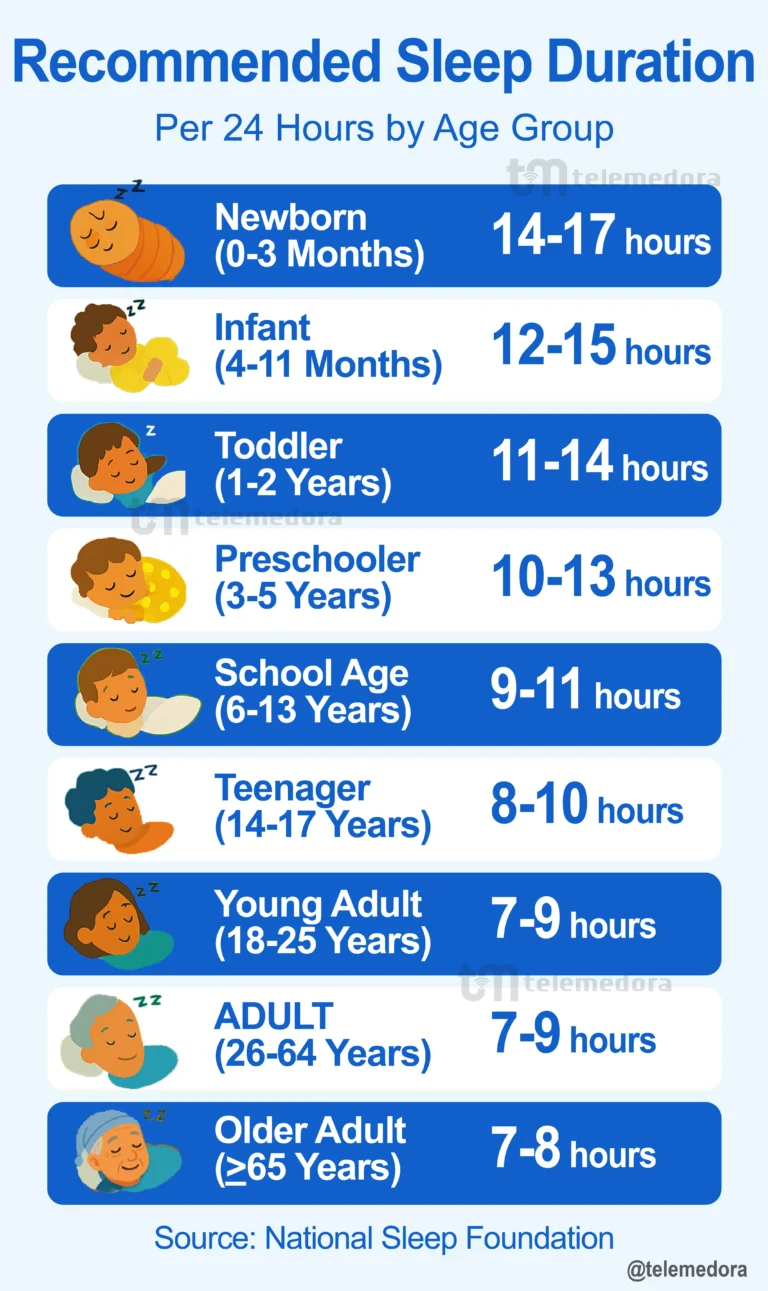According to the National Sleep Foundation, the recommended sleep duration varies across age groups. For instance, for newborns (0–3 months) it is around 14 to 17 hours, for infants (4–11 months) it is 12 to 15 hours, and for toddlers (1–2 years) it is 11 to 14 hours. Preschoolers (3–5 years) are recommended 10 to 13 hours of sleep, school-aged children (6–13 years) 9 to 11 hours, and teenagers (14–17 years) 8 to 10 hours. Young adults (18–25 years) and adults (26–64 years) are recommended 7 to 9 hours of sleep per night, while older adults (65+ years) 7 to 8 hours.