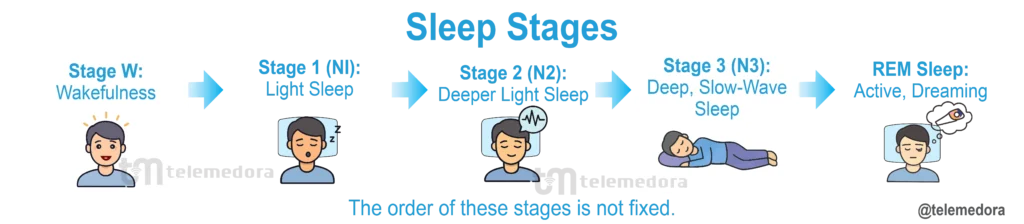 There are a total of five stages of sleep. Of which, one is wakefulness/alert, three stages belong to NREM sleep and one is for REM sleep. Each of these stages is defined by unique patterns of brain activity and physiological changes. During sleep, these stages do not occur in any single particular sequence. As mentioned earlier, each sleep cycle is of 90-110 minutes and repeats throughout the night, forming the building blocks of a restorative sleep experience.